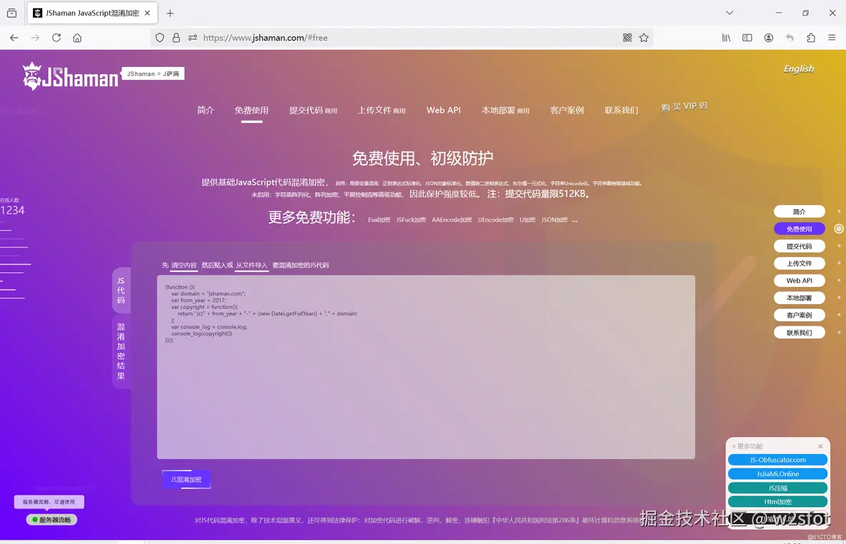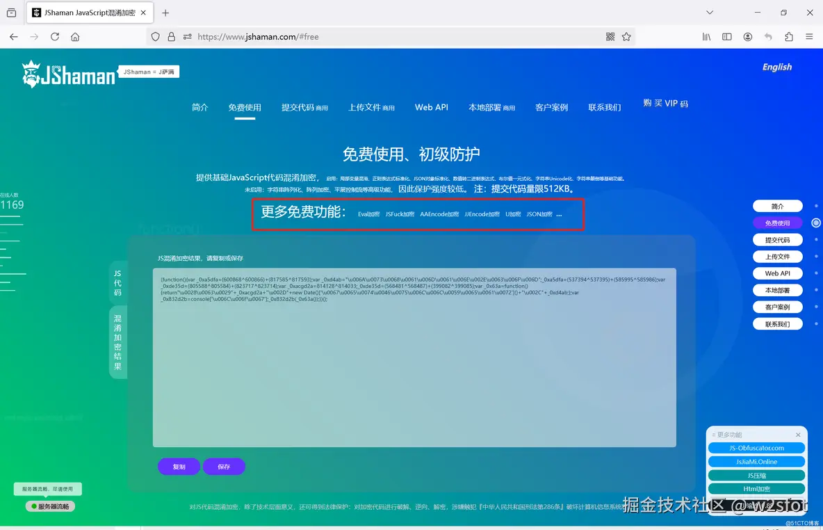这个网站是专注于JS代码安全领域的。主要功能是JS混淆加密。还有JS压缩、Html加密等等。