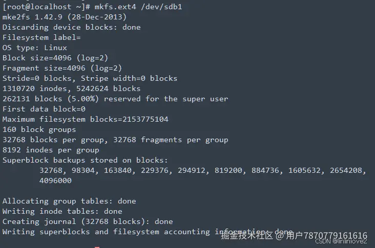 14、格式化分区,这里输入看到的磁盘加分区号 如下图为/dev/sdb1 已格式化的可跳过