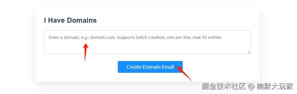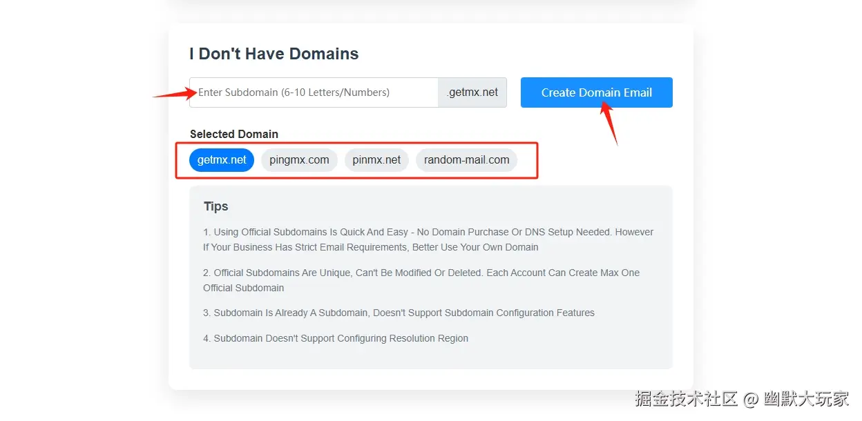 - 如下图,随便输入一个名字 选择你喜欢的后缀,点击“Create Domain Email”,域名邮箱就创建成功了