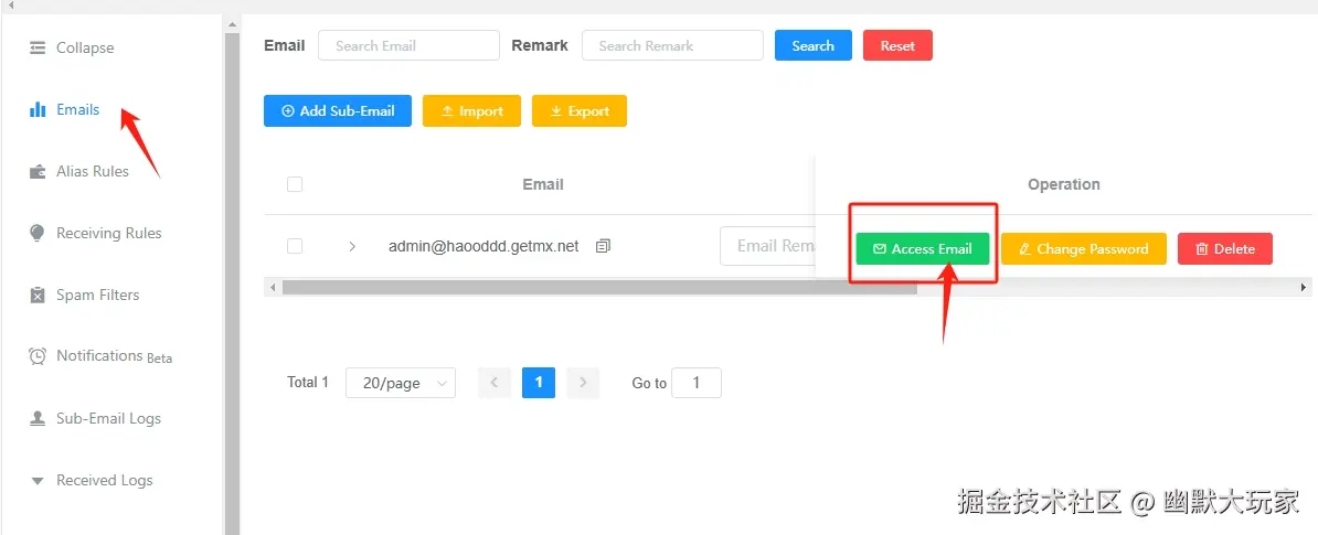 - 进入邮箱:左侧菜单栏“Emails”——“Access Email“,进入后可以查看邮件内容