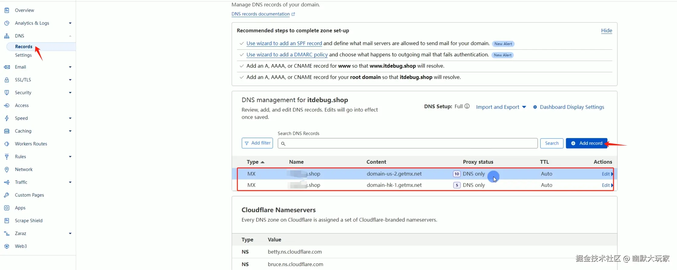 - 同样进入 “Manage Email” 页面,选择 “Inbound DNS”, 需要将记录值填写到CloudFlare(域名平台)中。
