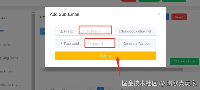 - 输入你想要的邮箱前缀和密码,点击“Create” 完成你的邮箱账号创建