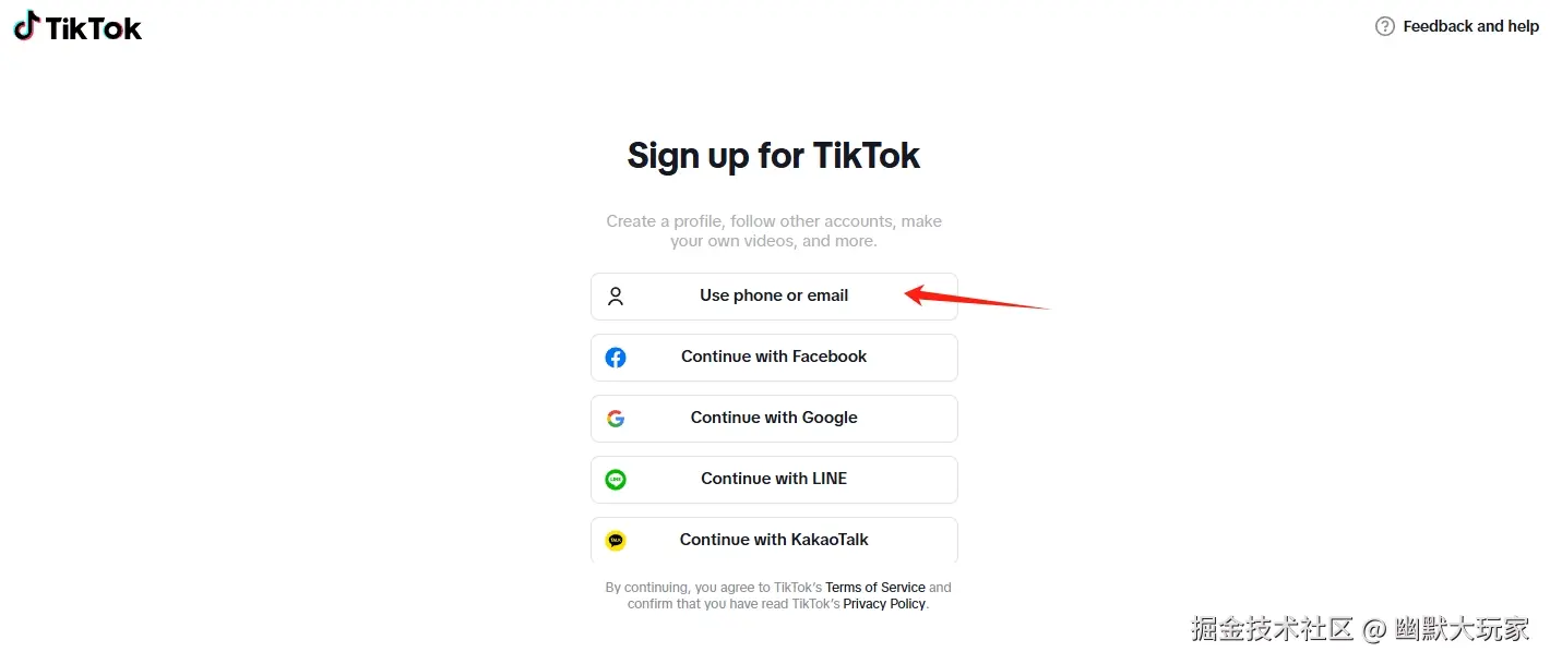 - 进入Tiktok官网,点击"Sign Up",选择”Use phone or email“注册