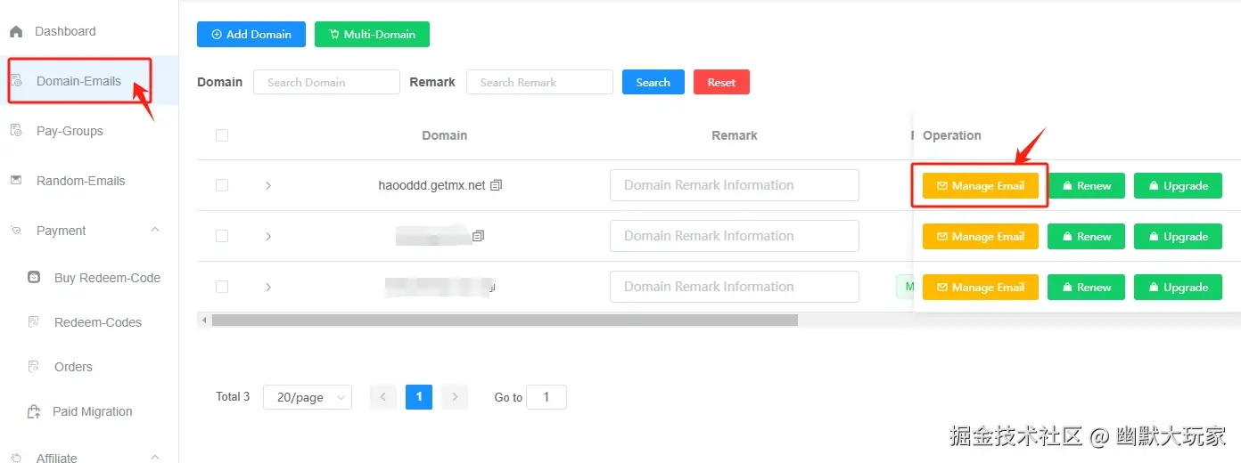 - 同样点击左侧菜单栏“Domain Email”——“Manage Email”