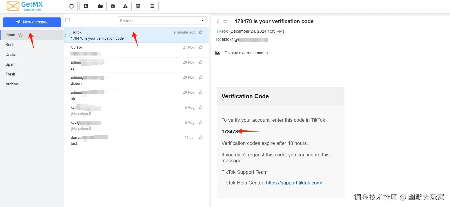 完成上述配置后,您可以开始使用该域名邮箱注册TikTok账号。只需要在TikTok注册页面输入您所创建的任意前缀的邮箱地址,系统会自动向该邮箱发送验证码。通过这种方式,您可以利用同一个域名邮箱,注册任意数量的TikTok账号。