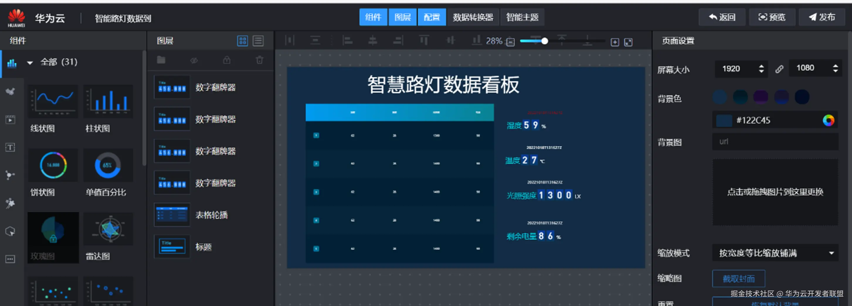 甚至DS小龙哥直接在论坛中发表了一篇《手把手教你完成智慧路灯项目开发》的文章,通过图文形式,详细介绍了一个物联网设备如何上云,云平台如何配置,数据可视化大屏如何对接显示的整个流程。整个开发过程共需要六步,首先是注册华为云账号,在物联网模块里,创建产品,创建物模型,创建设备。再采用MQTT客户端,以软件来模拟设备的方式登录华为云物联网平台,实现路灯数据的模拟上传。接着是开发底层硬件代码,完成设备上云的对接。然后购买ECS云服务器,搭建NGINX服务器,作为流媒体服务器接收摄像头上传的数据流。还有创建OBS数据存储桶,完成数据存储。最终创建数据可视化DLV大屏,显示设备上报的数据。他表示:“华为云IoT平台提供了一整套完善的设备接入、数据管理、应用开发等解决方案,使得我们可以快速搭建系统并进行部署。同时,华为云IoT平台的稳定性和可扩展性也给了我们很大的帮助,保障了系统的顺畅运行。”