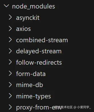 扁平结构是安装一个包,这个包所依赖的包将一起被安装到同一级目录下。小明同学运行了一下,仅仅<font style="color:rgb(28, 30, 33);">npm install axios</font>,展示在node_modules里显得非常多,这是因为axios需要的依赖例如<font style="color:rgb(28, 30, 33);">form-data</font>也被塞到和axios同级目录了。