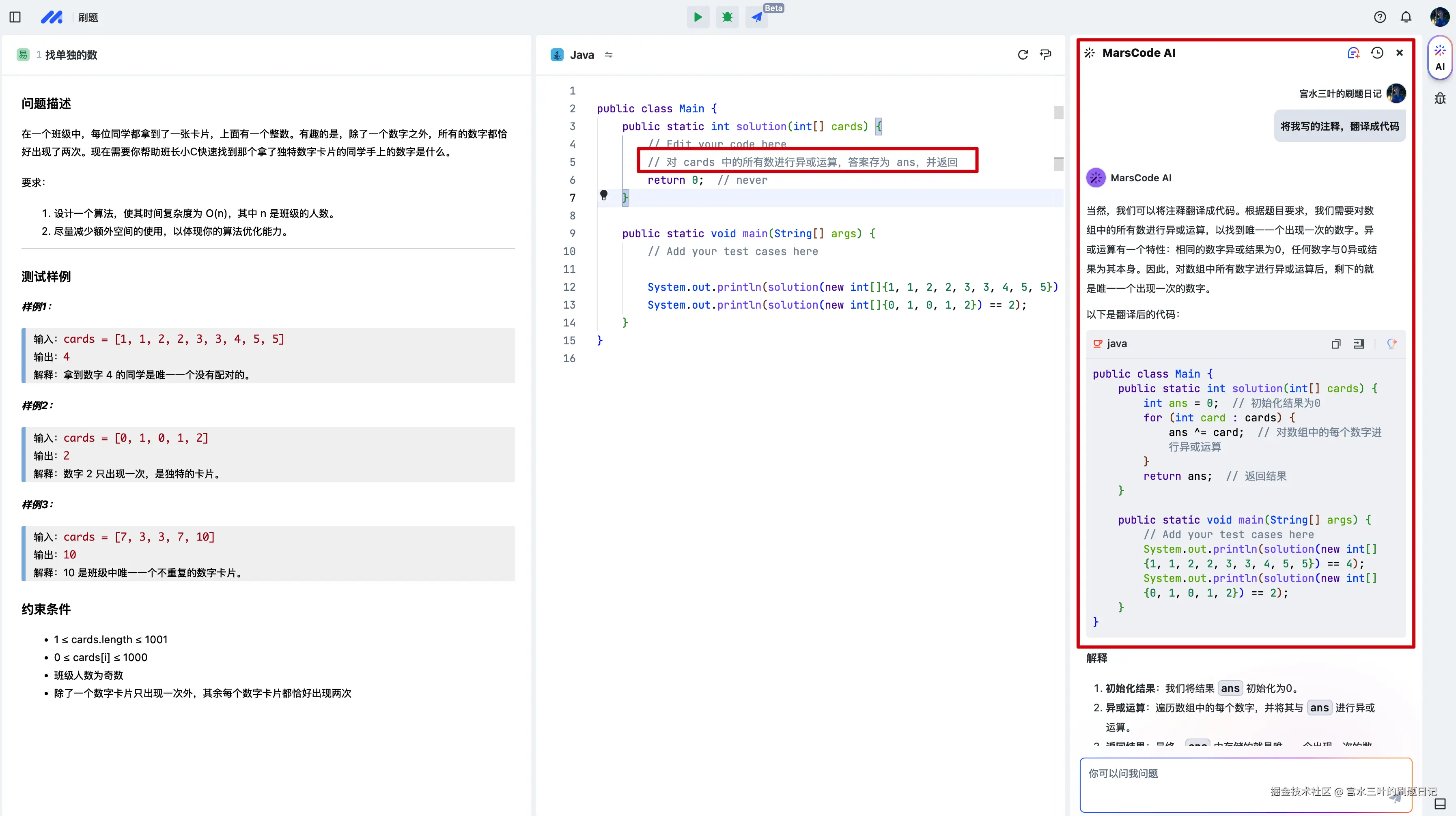 在豆包MarsCode中找道大家都看得懂的题目来带大家感受一下,题目是「找单独的数」(这也是题库中的第一题)。