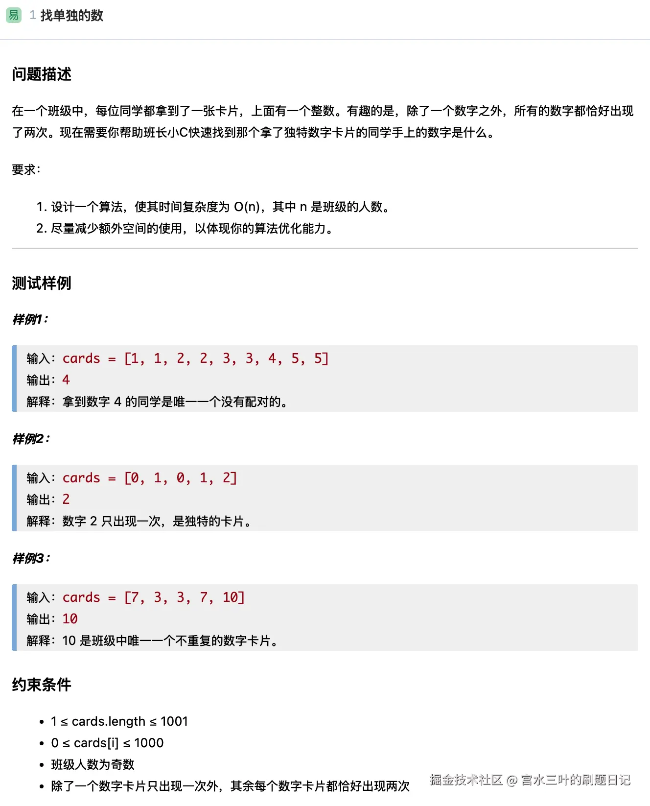 但最优解,必然是时间复杂度为 ,空间复杂度为 的异或做法。