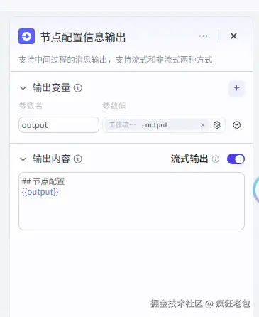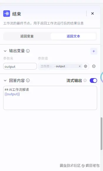结束节点就像是工作流的最后一个站点,它负责把工作流完成后的结果告诉用户。可以想象成,你让智能体去跑腿办事,结束节点就是它回来的时候,告诉你“事情办妥了,这是你要的东西”。