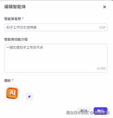2、创建智能体 输入你的智能体名称和功能介绍,然后点击图标旁边的“生成图标”按钮,系统会自动为你生成一个头像。