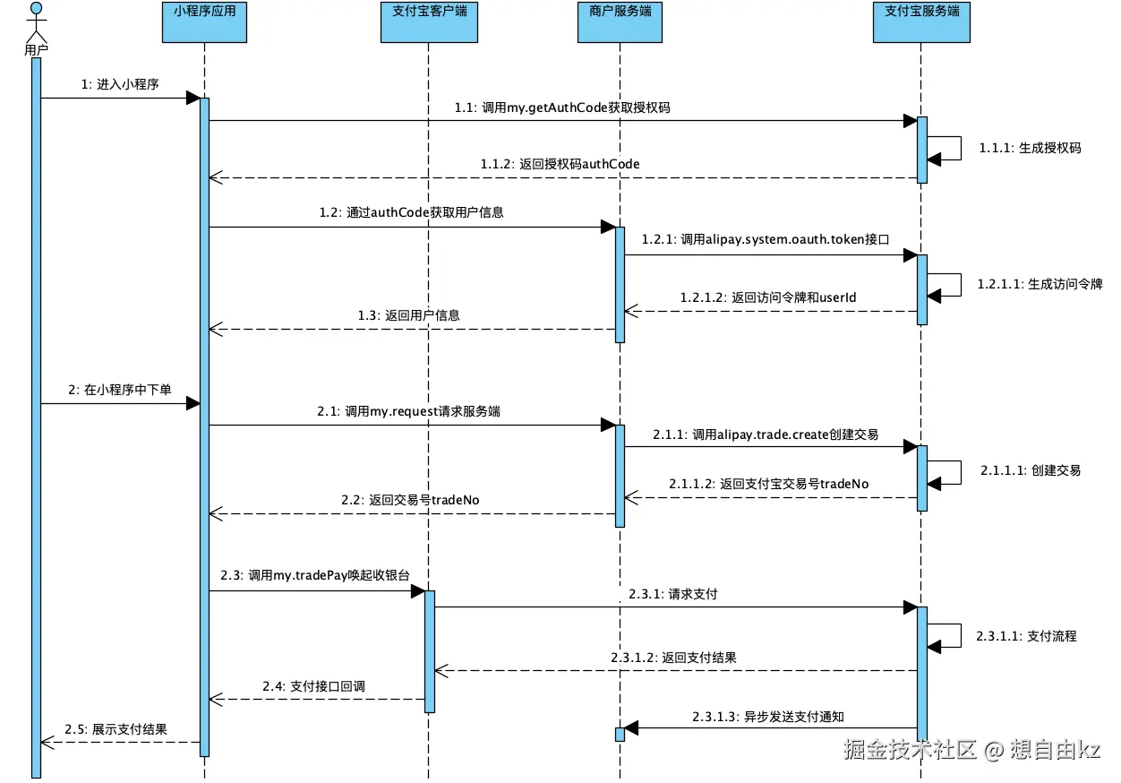 步骤2.3 商户可在支付宝小程序内通过 my.tradePay(唤起收银台进行支付) 调起支付宝支付,发起支付请求。