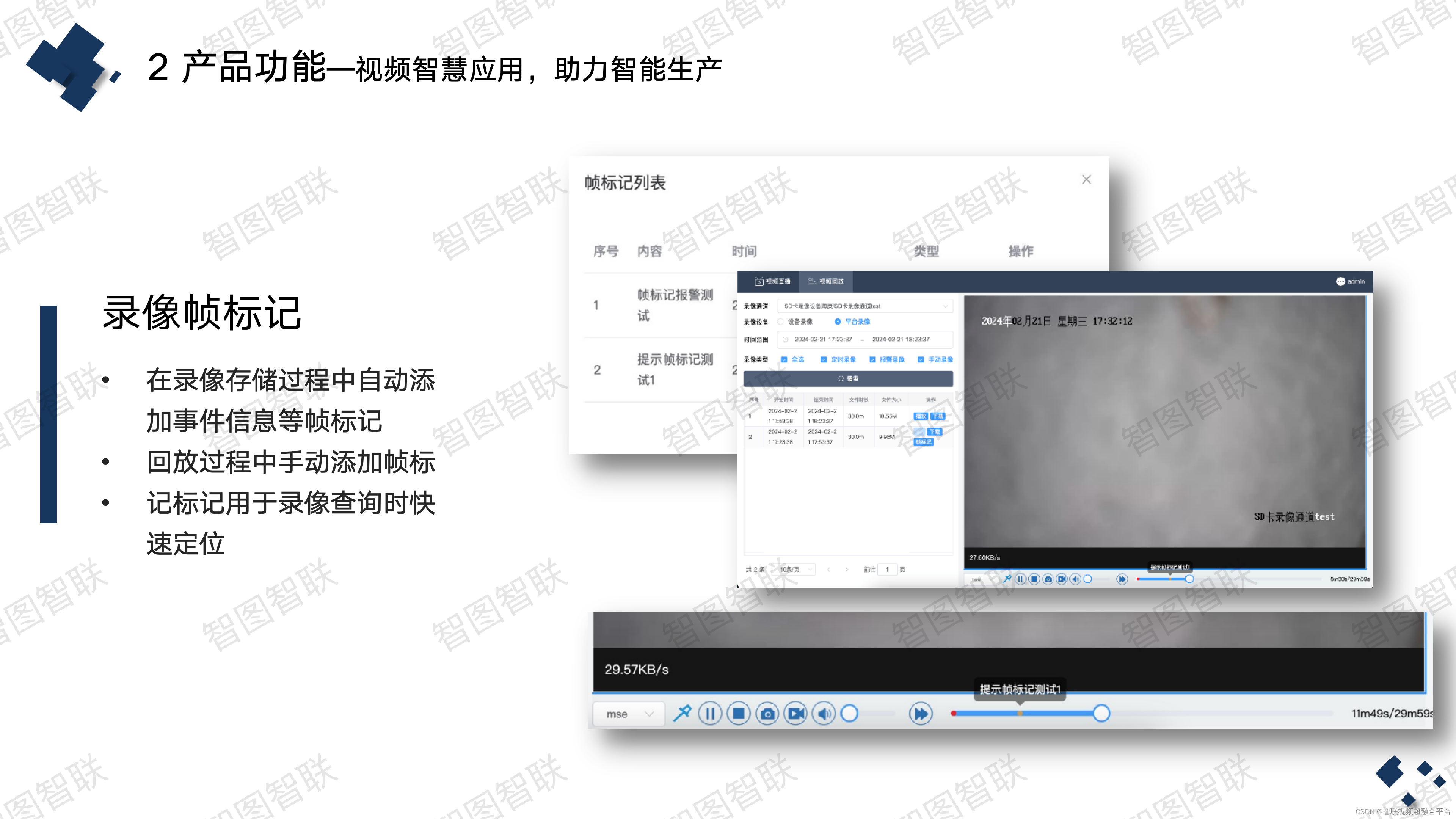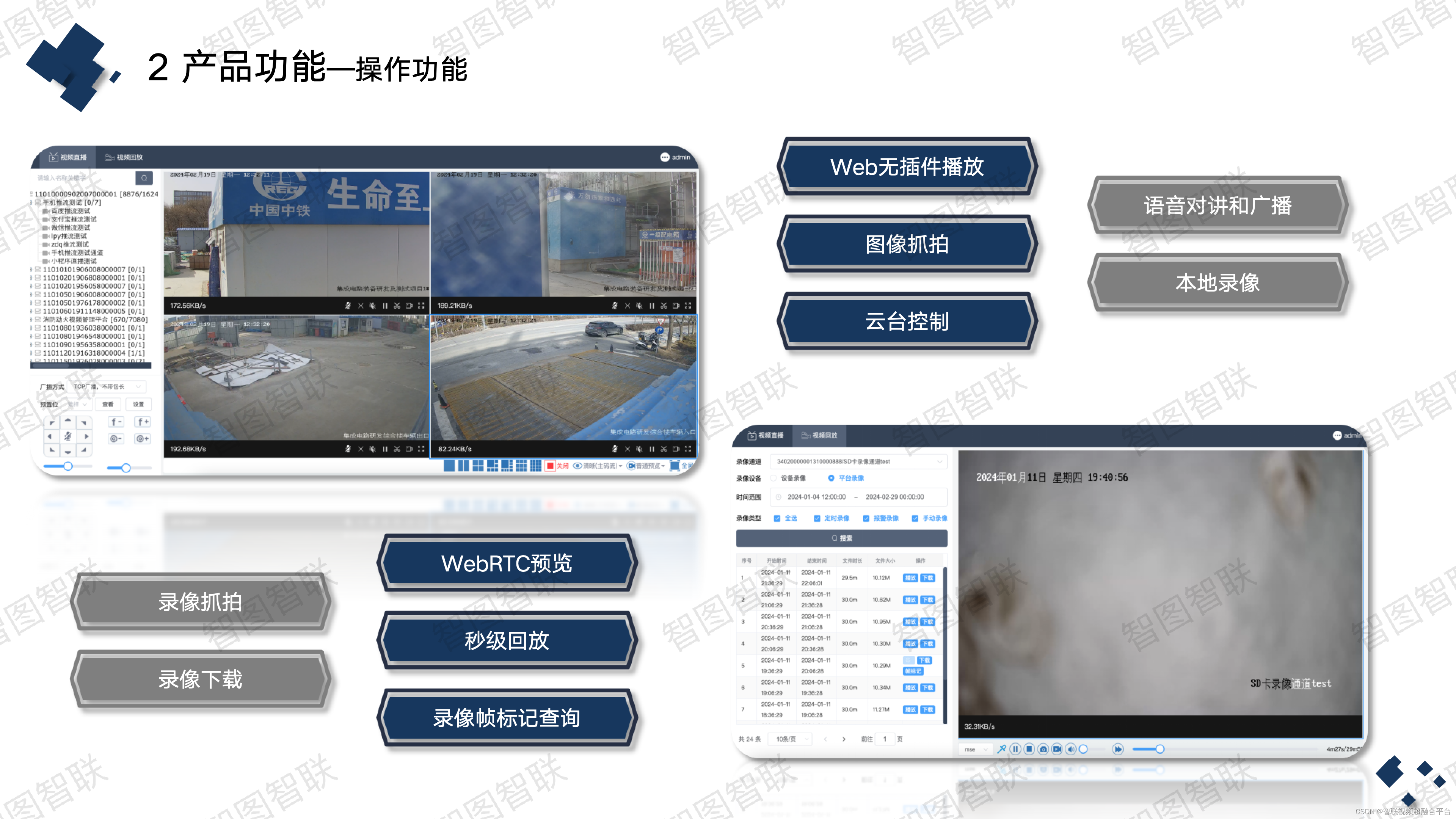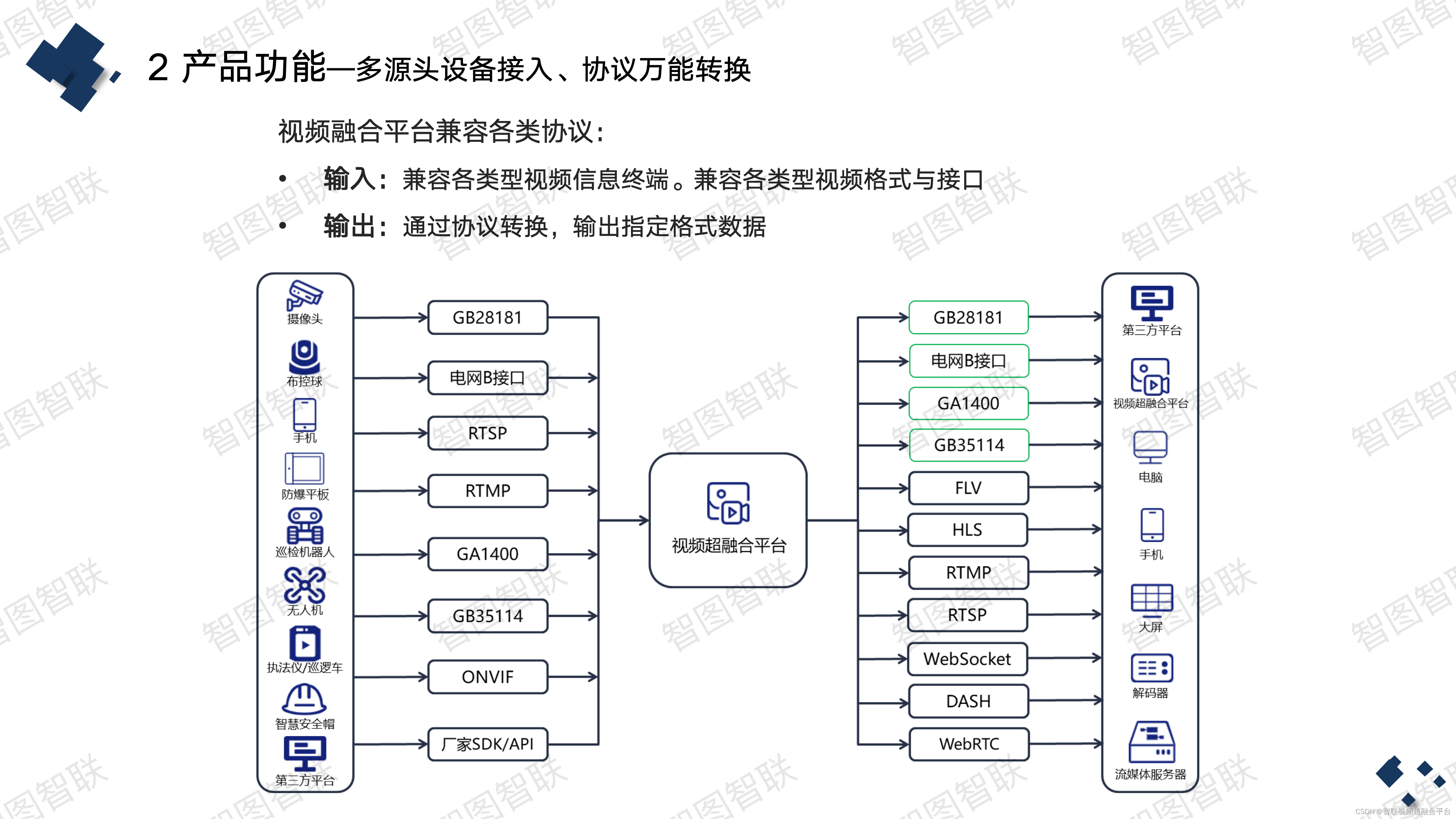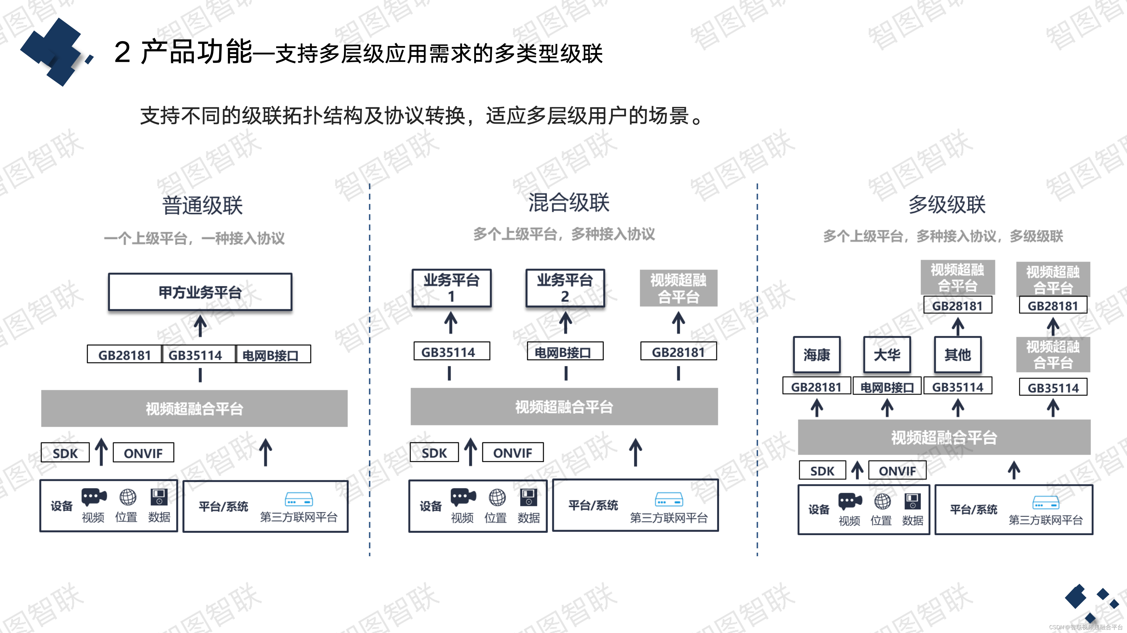 智联视频超融合平台通过GB/T28181-2011/2016/2022、国网B接口、RTSP、RTMP、ONVIF、GB/T35114、GA1400、海康大华SDK/API等方式,接入海康、大华、宇视等各个厂家的摄像机、录像机,接入直播手机,接入下级平台,提供web客户端进行视频预览、录像回放、配置管理和智慧运维。提供标准RESTful格式的HTTP API,提供web播放器demo,满足二次开发需求。同时支持将音视频数据等转发成各种通用标准的流媒体协议,方便第三方客户端调用展示。支持按照GB/T28181-2011/2016/2022、国网B接口、GB/T35114、GA1400等协议对接到上级平台,包括智联视频云平台和第三方平台。部署上支持普通级联,多级级联,混合级联等多种级联方式。