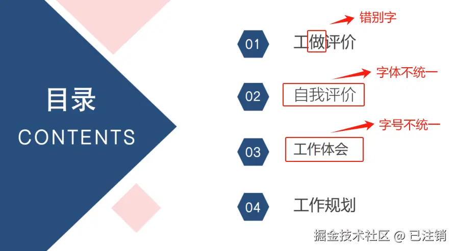 往往一个技术细节控,能够设想到程序的各种边界情况的小伙伴,却在 PPT 上犯了各种各样的低级错误,比如,字体,字号,格式不统一,甚至还会出现错别字。