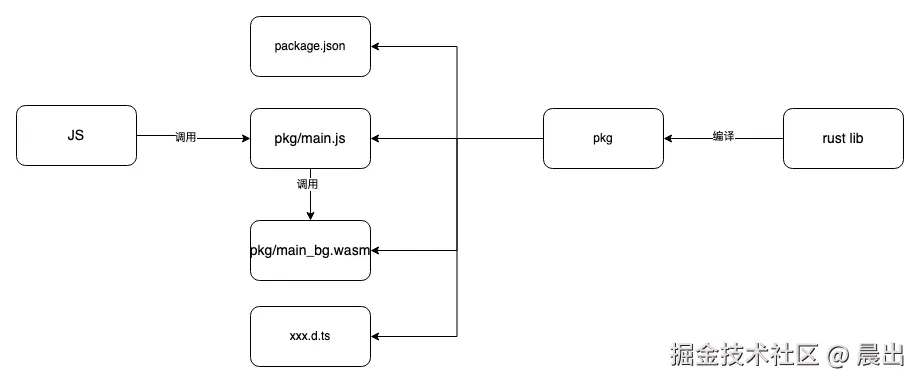 通过wasm-pack 将 Rust 打包成可发布的 npm 包,js 通过调用 npm package 来调用编译好的 wasm 模块