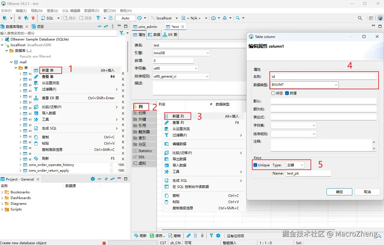 新建表,然后右键选择添加字段,在DBeaver中,[v]符号代表是,[]代表否,这里我们创建一个主键ID,选择自增;