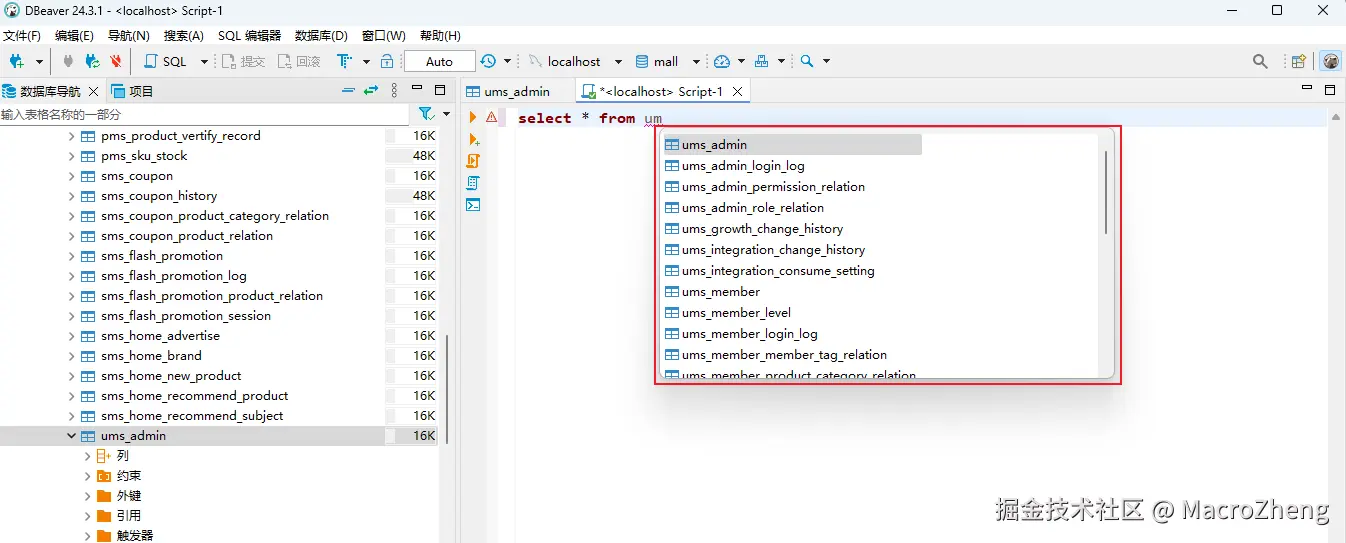 - DBeaver的SQL提示功能还是挺强大的,对于SQL关键字、函数、数据库表和字段都支持了;