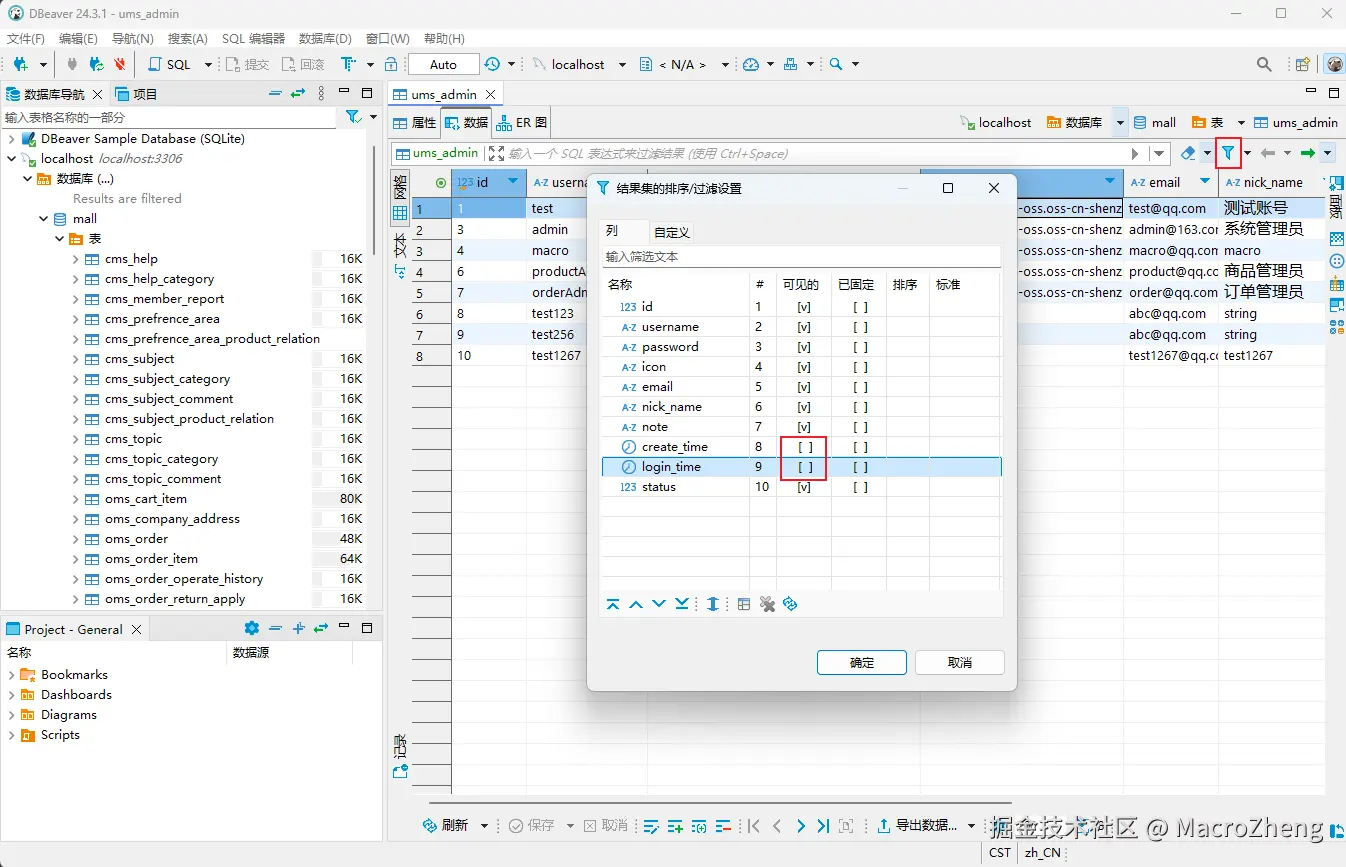 - 如果我们不想显示某些字段,可以点击右上角的筛选按钮,然后把过滤字段