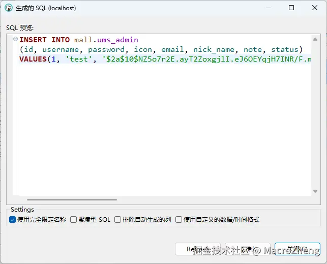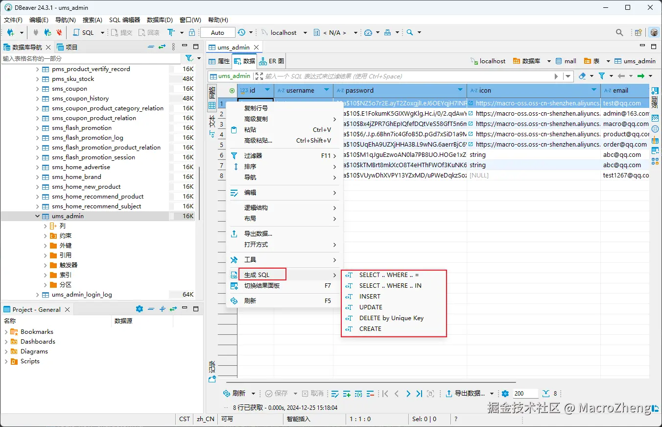 insert所有字段的语句,此时手写比较麻烦,我们可以直接使用DBeaver生成SQL功能,右键选择一条记录,选择生成SQL即可;