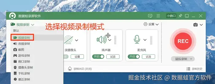 步骤1:首先你需要打开数据 蛙录屏软件,然后根据需要选择合适的录制模式。本文选择“视频录制”模式。