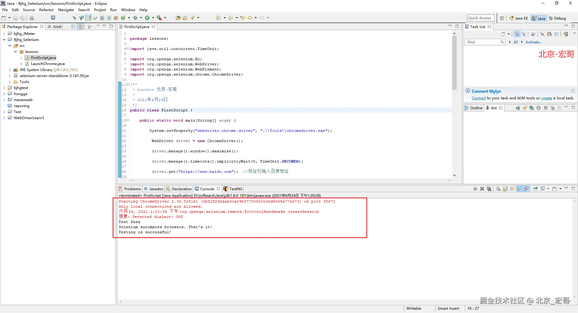 前面几篇宏哥介绍了两种(java和maven)环境搭建和三大浏览器的启动方法,这篇文章宏哥将要介绍第一个自动化测试脚本。前边环境都搭建成功了,浏览器也驱动成功了,那么我们不着急学习其他内容,首先宏哥搭建好的环境中创建首个完整的自动化测试脚本,让小伙伴或者童鞋们提前感受感受,也是为了激起大家的学习兴趣。
