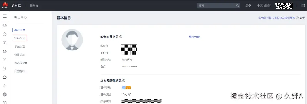 打开华为云账号中心,选择左侧的“实名认证”。