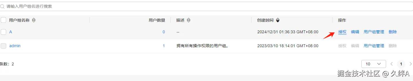 点击用户或用户组右侧的“授权”按钮。