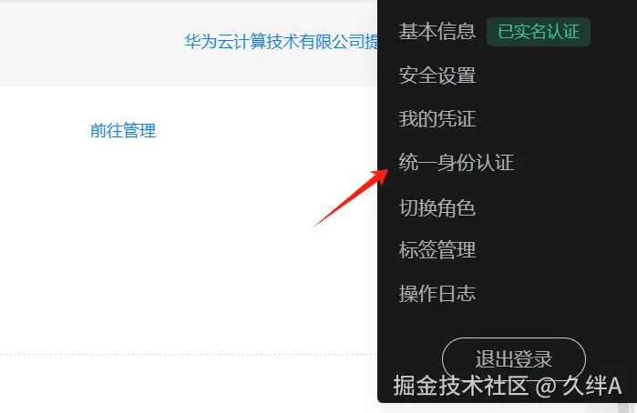在账号中心页面,再次鼠标移至页面右上角下拉菜单,点击“统一身份认证”,进入统一身份认证服务页面。