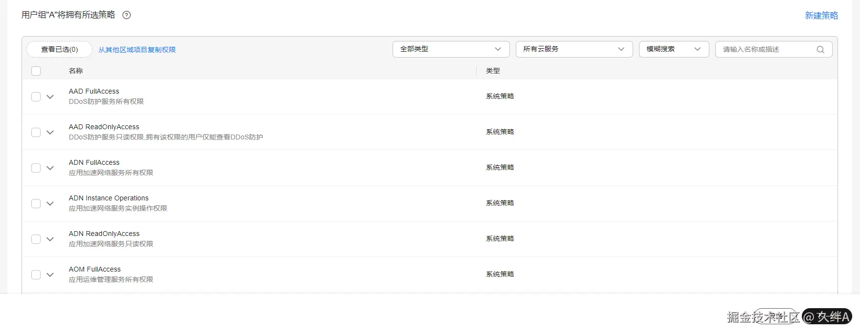 在授权页面,搜索并选择需要授予的权限策略