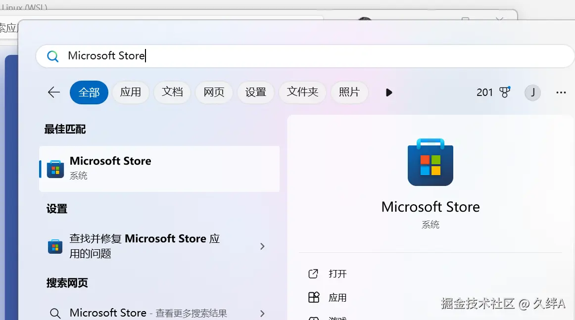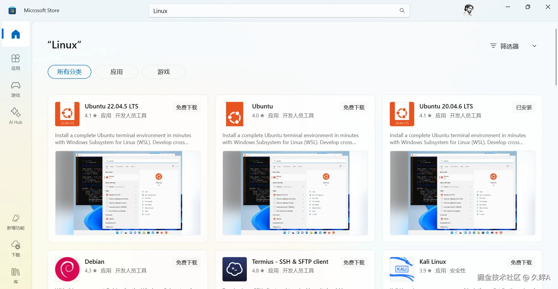 打开Microsoft store,搜索Linux,下载安装合适或者喜欢的Linux发行版本