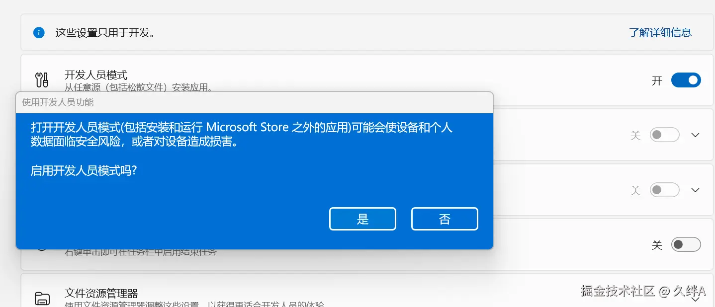 win,在搜索栏输入(开发者设置),打开开发人员模式启用