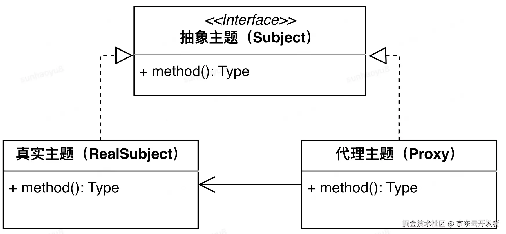 以上例子展示了一个代理模式的基本实现。代理模式(Proxy Pattern) 的定义是:使用代理以代替对真实对象的访问。 它属于一种结构型设计模式。