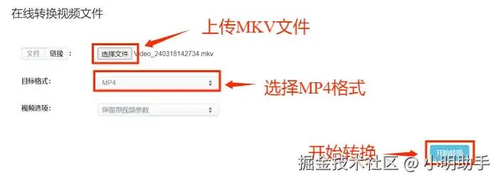 第三步:点击【选择视频】按钮上传MKV视频文件,然后设置MP4为目标格式。点击右下角的【开始转换】按钮开始转换视频格式,最后下载视频即可。