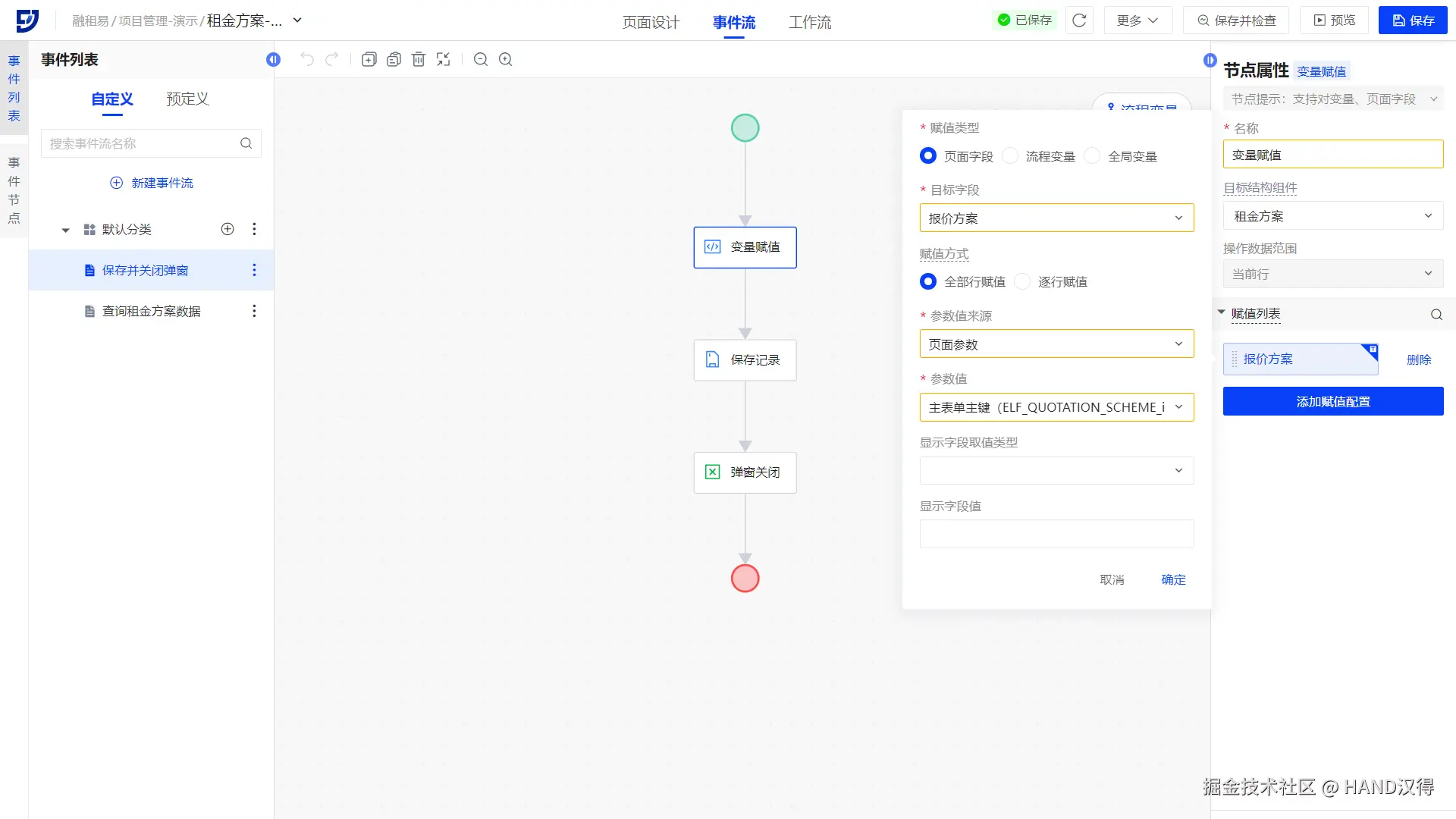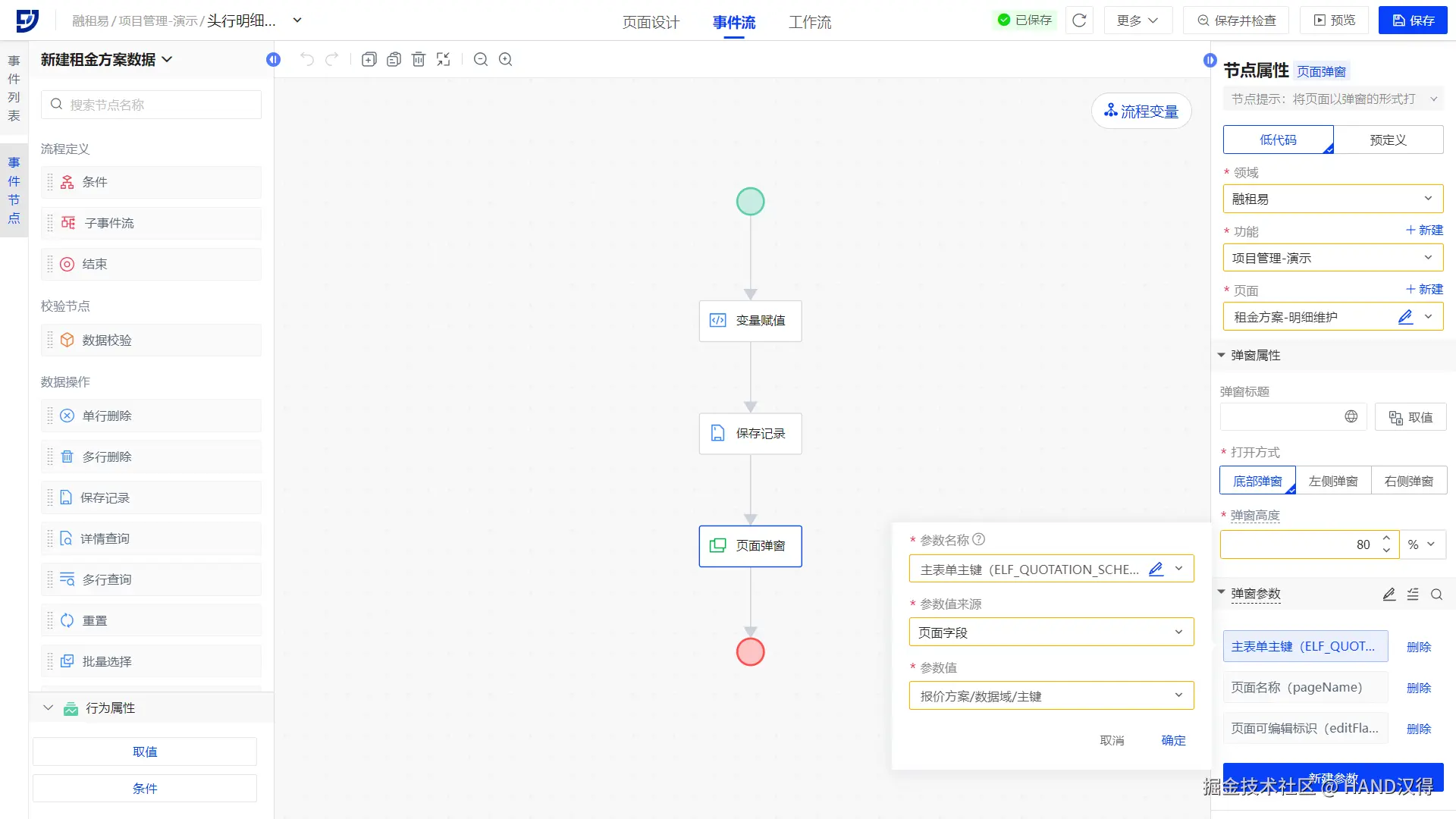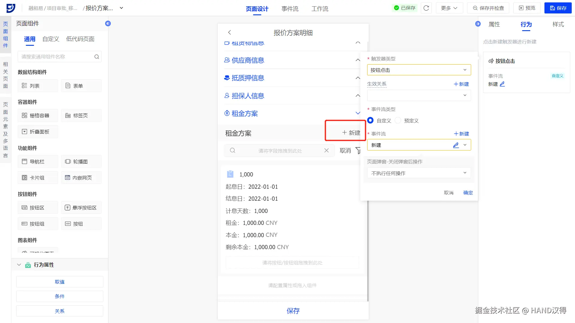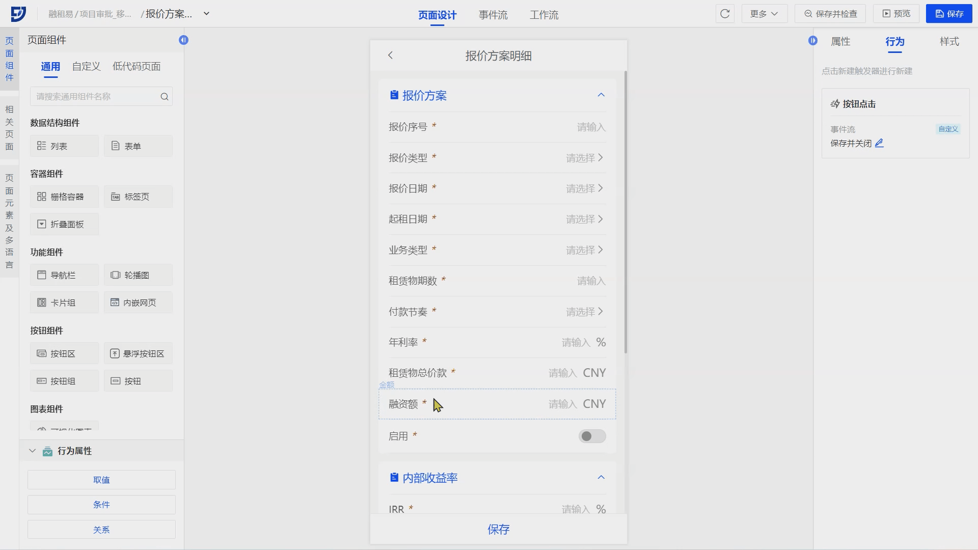 报价方案弹窗页内添加租赁物信息、供应商信息、抵质押信息、担保人信息、租金方案等明细行列表组件,并配置关系及保存按钮,实现行-明细数据的联动查询;