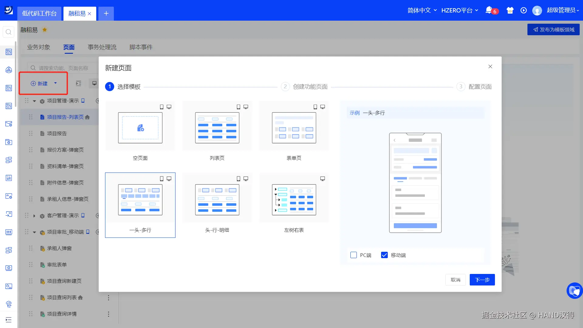 功能列表页点击【新建】按钮,当前选择移动端一头-多行模板,点击下一步;