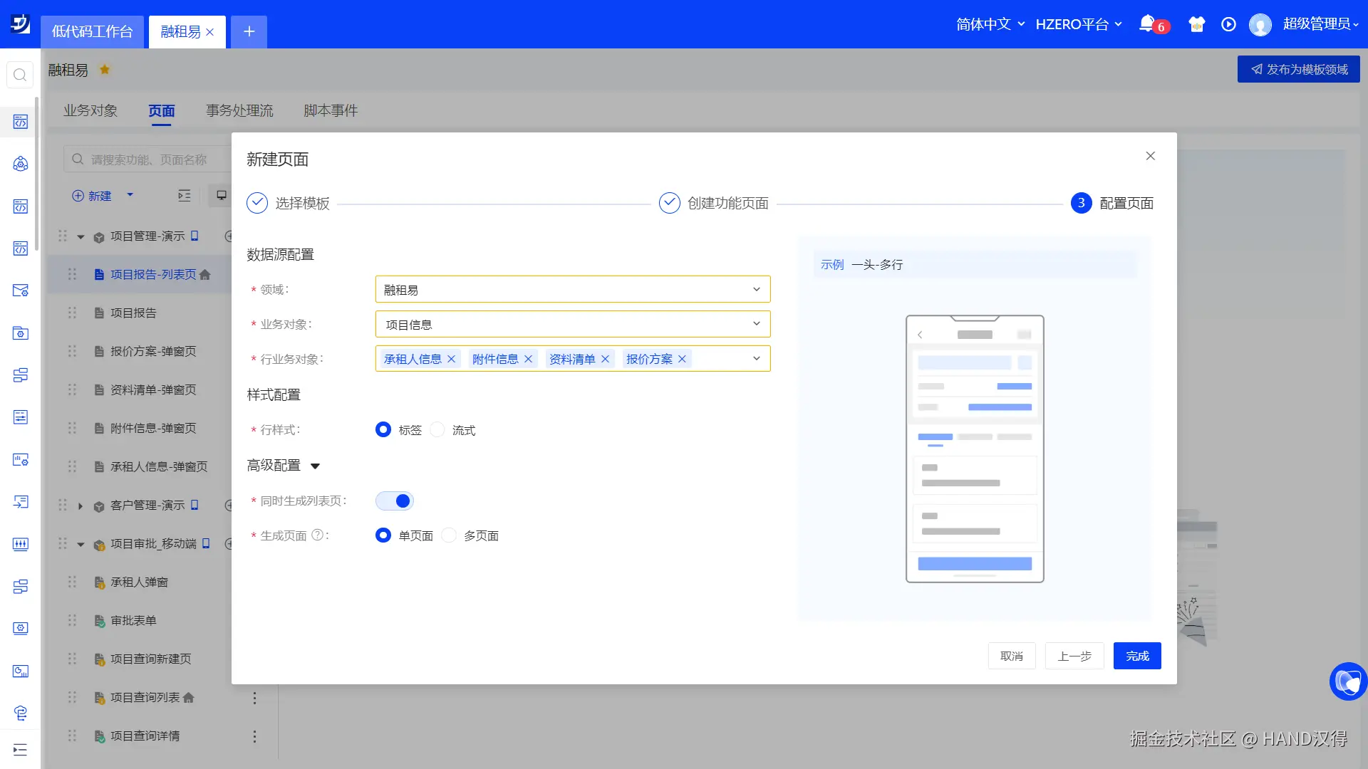 一头多行模板适用的数据结构为一个主对象及多个从对象的表,以项目管理场景为例,项目信息为主对象,需要级联维护或查询承租人信息、报价方案、资料清单等从对象的数据。