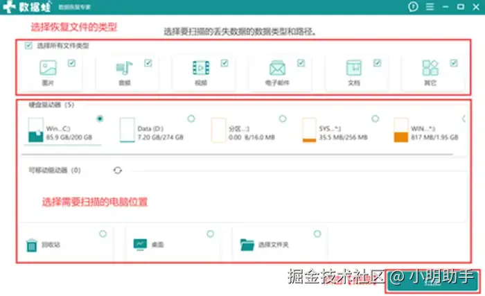 步骤1: 在电脑桌面上打开这款软件,在软件的首页上选择自己需要恢复的文件类型后再选择扫描位置即文件丢失的位置,最后点击【扫描】;