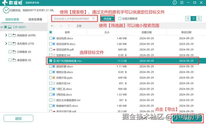 步骤2: 在软件扫描结束后,可以借助【搜索框】、【筛选器】等工具找到自己需要恢复的文件,点击【导出】;