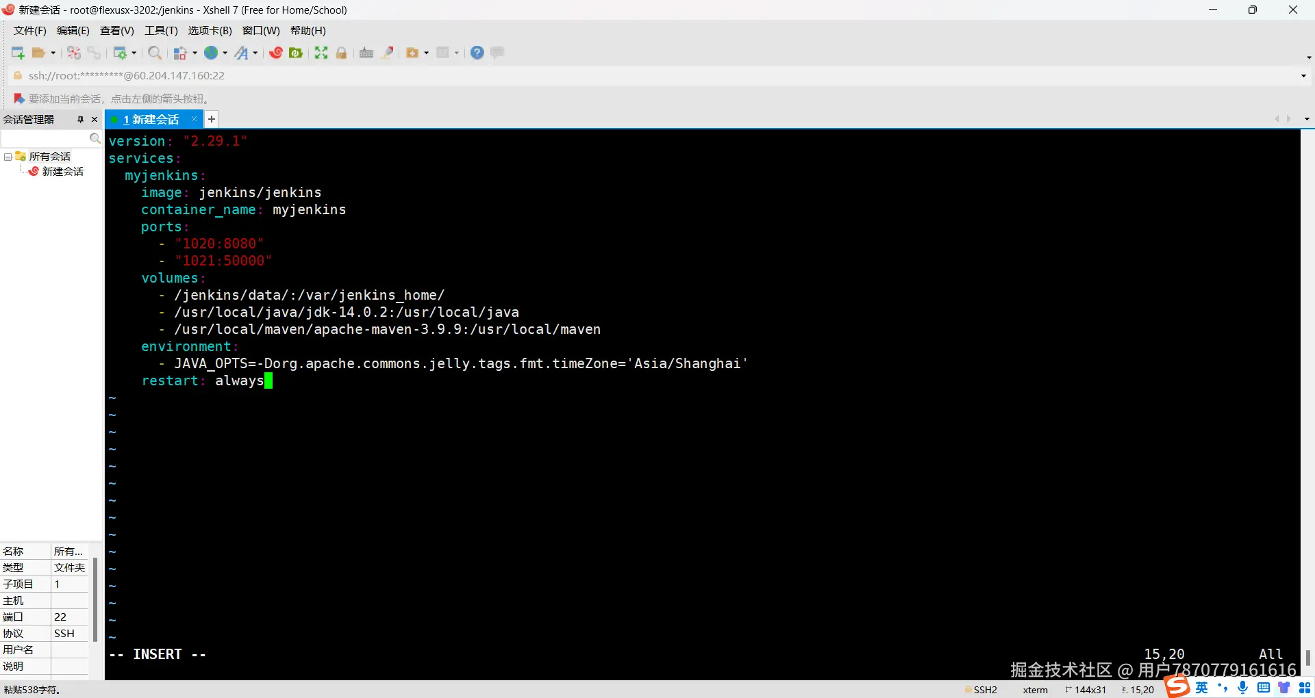 •编写 Docker Compose 配置文件在 /jenkins目录下创建一个 docker-compose.yaml 文件,使用以下命令打开编辑器