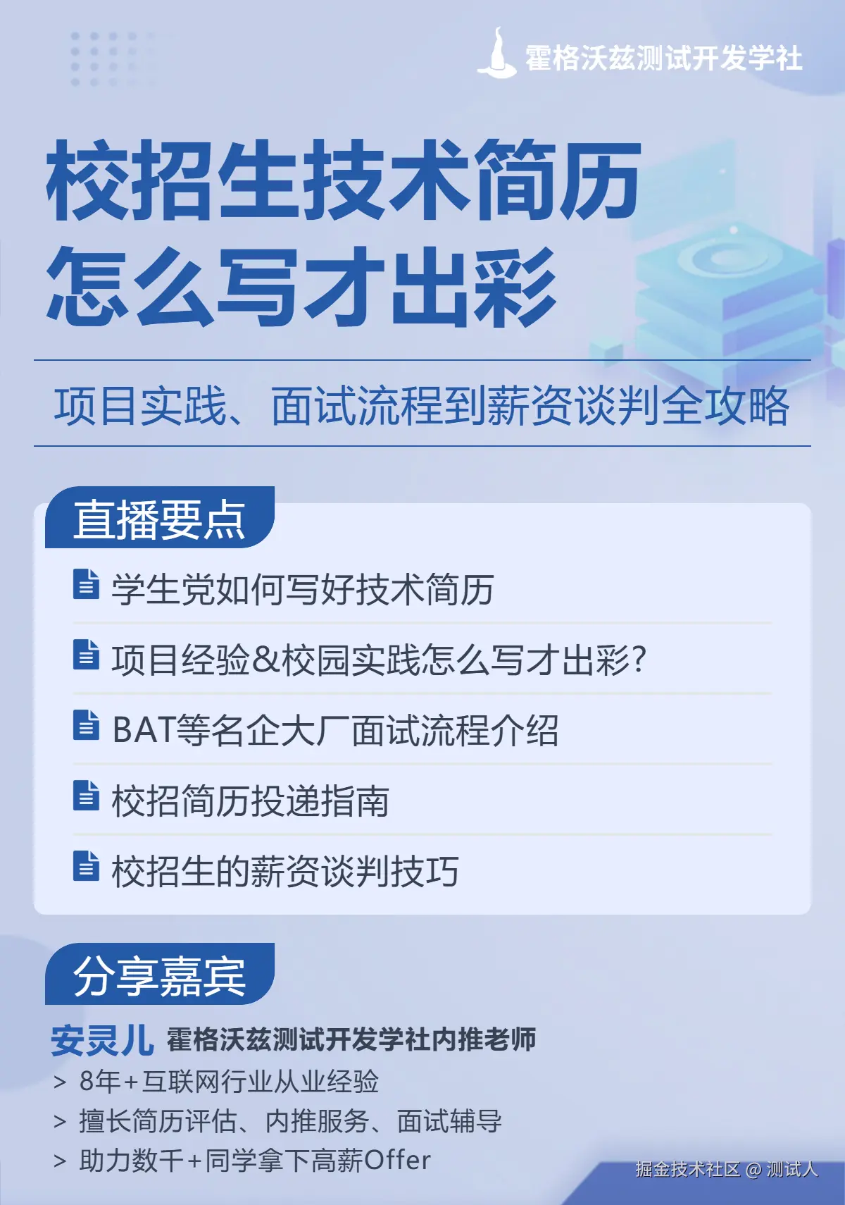 亲爱的同学们,你们是否正站在校招的十字路口,手握技术梦想,却对如何撰写一份吸引眼球的技术简历感到迷茫?是否渴望了解BAT等名企大厂的面试流程,却又担心自己的简历石沉大海?别担心,我们为你精心准备了一场公开课,从项目实践到薪资谈判,全方位助力你的校招之旅!
