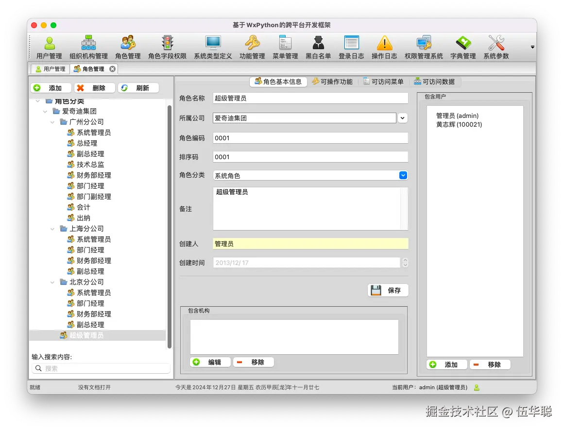 在WxPython的项目中,角色信息的展示也是类似的多选项卡来实现分来展示的。其中包括:角色基本信息、可操作功能、可访问菜单、可访问数据等等内容。如下界面所示。