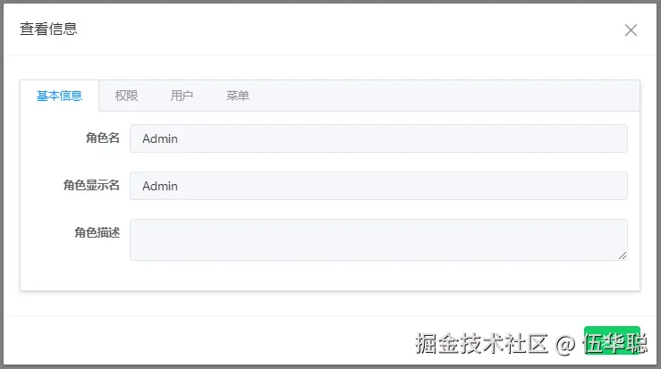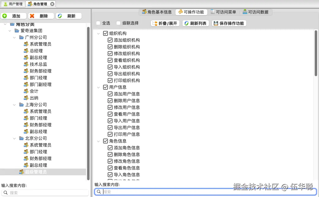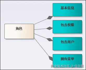 其中每个角色,除了包含基本信息外,还会包含拥有的权限(功能控制点)、包含用户,以及拥有的菜单,其中权限是用来控制界面元素,如操作按钮的显示的,而拥有的菜单,则是用户以指定账号登录系统后,获得对应角色的菜单,然后构建对应的访问入口的。