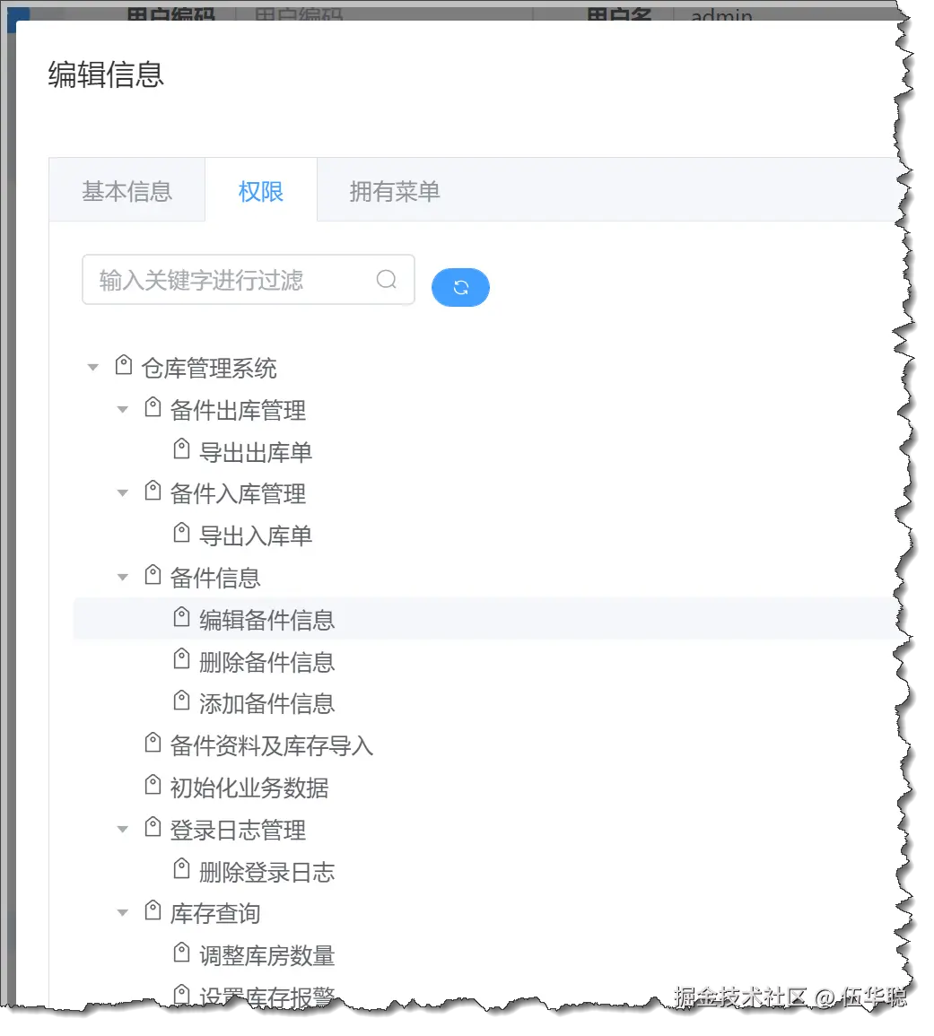另外用户信息和角色信息类似,也需要展示复杂的相关信息,用户本身拥有的权限功能点和拥有的菜单,如下界面所示。