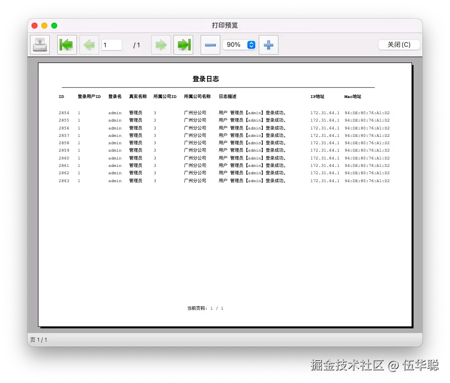 如果没有分页信息,那么底部空白一些,还是会绘制页码信息,如下是没有更多记录的时候打印预览的界面效果
