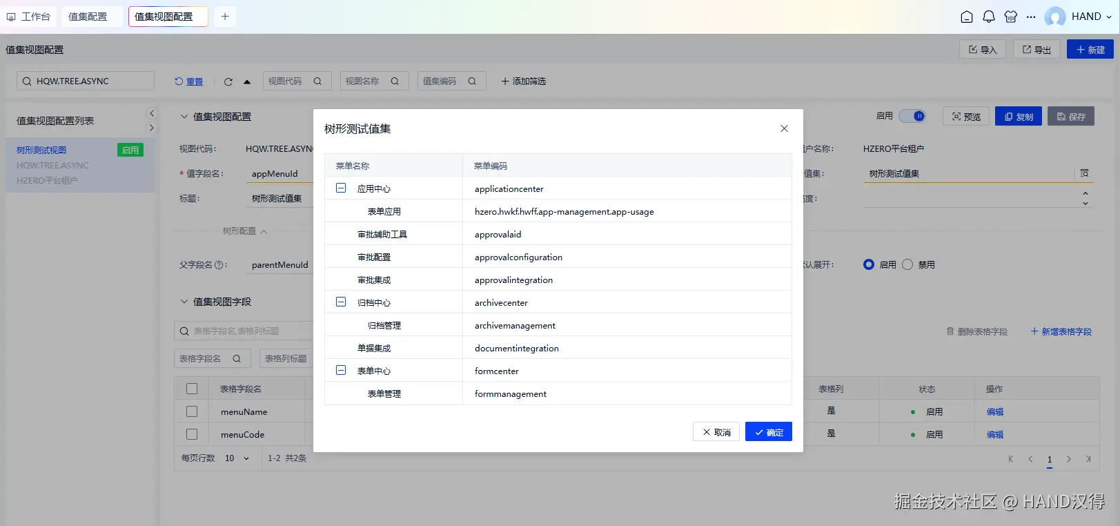 图中区域 ① 的值字段名除了关联值字段外,树形值集中它还是用于关联树形结构的 id 字段 名, 对应数据示例的 appMenuId 字段。
