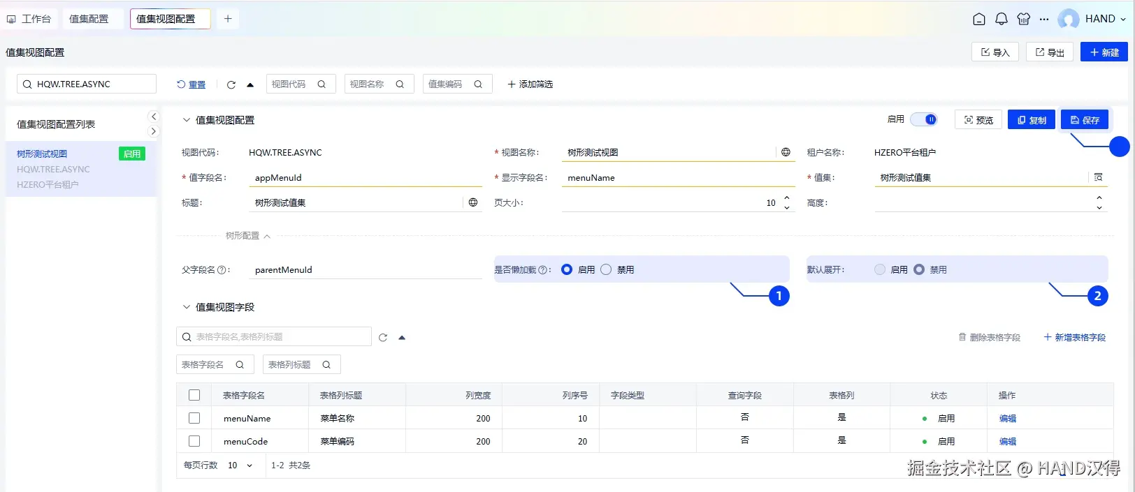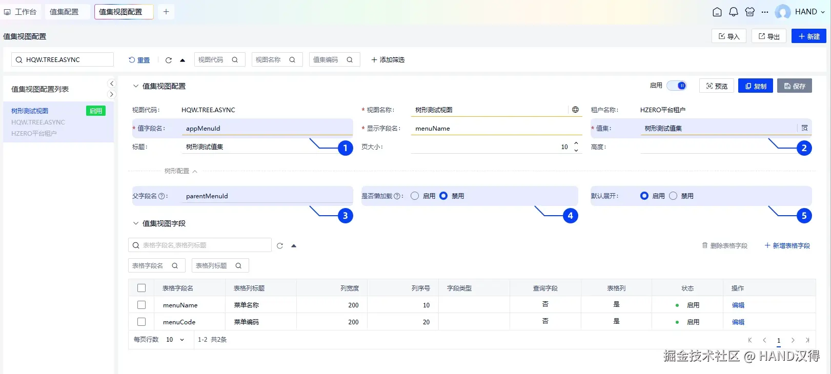 我们需要配置图中区域 ③ 的父字段名,对应数据示例的 parentMenuId 字段,用于树形结构中的父子级关联,并且它也是开启树形值集的开关。