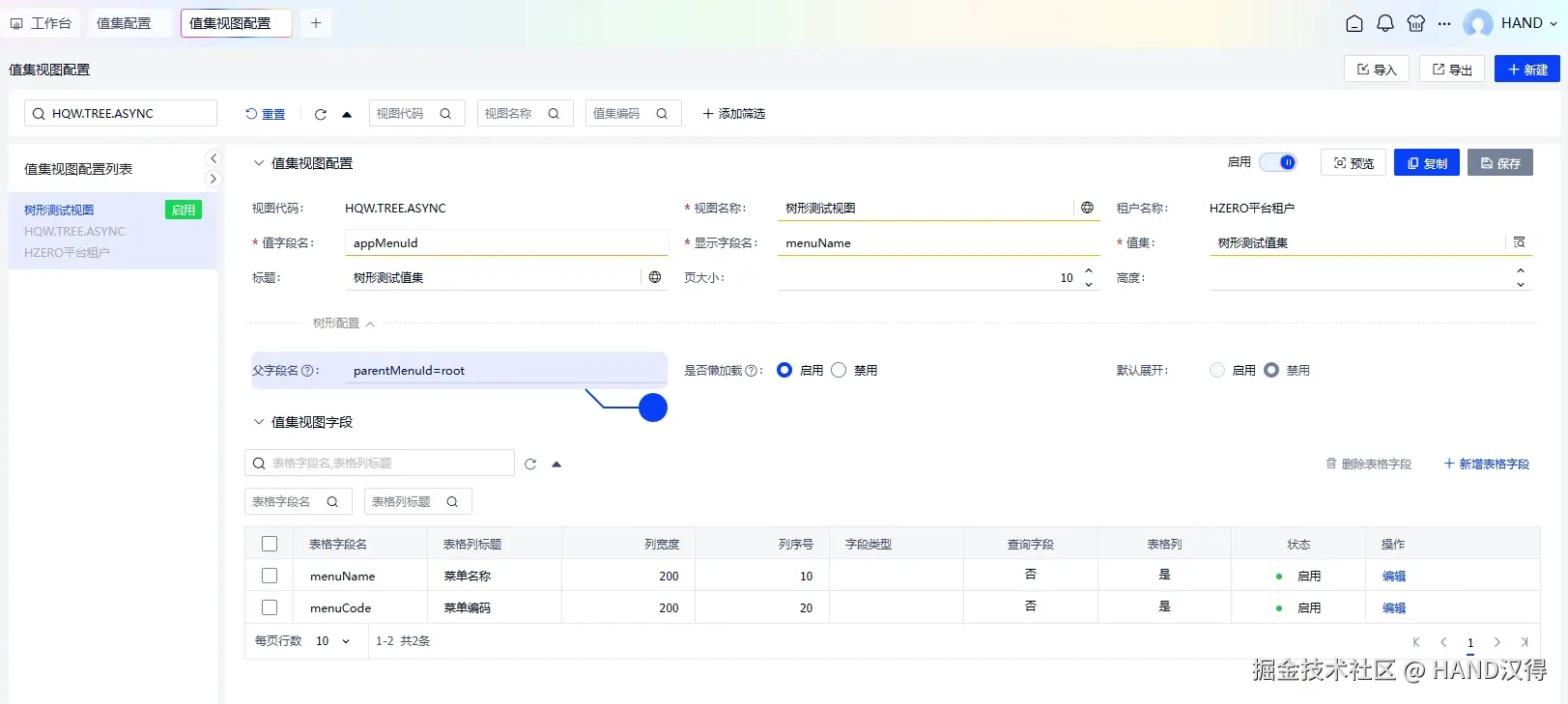 - 我们现在支持通过父字段名配置成表达式的方式自定义根节点查询参数,如:我们可以把这里的父字段名配置成 parentMenuId=root,在根节点查询时就会带上 parentMenuId=root 的参数,使用起来更加便捷高效。