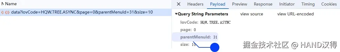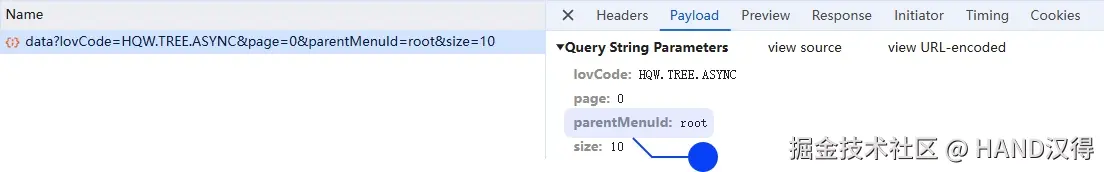 - 通过点击 【预览】 按钮后可以从网络请求看到,查询根节点的接口就会携带我们指定的参数啦!