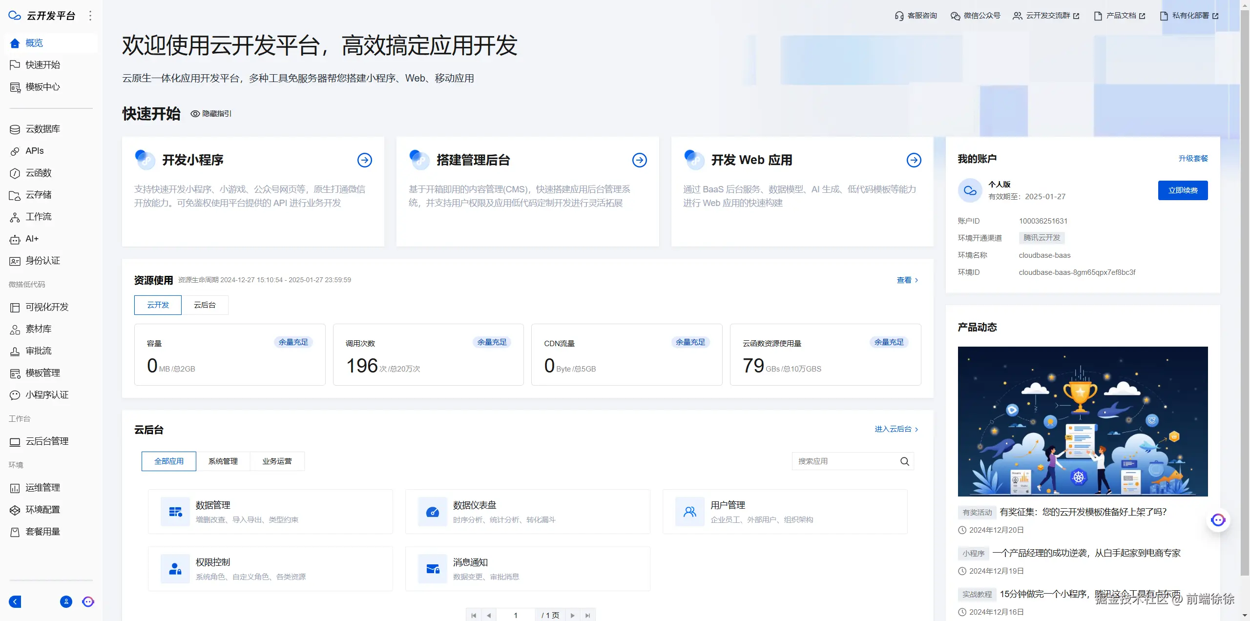 这个方案是在和同事聊天的时候突发想到的,需要找一个像微信云开发的服务,可以直接通过调用各种 API 实现服务逻辑。后面就找到了腾讯云的 cloudbase 云开发平台,然后就注册使用了起来,简直就是神器,可以云调用服务,云调用数据库等各种后端服务的操作。