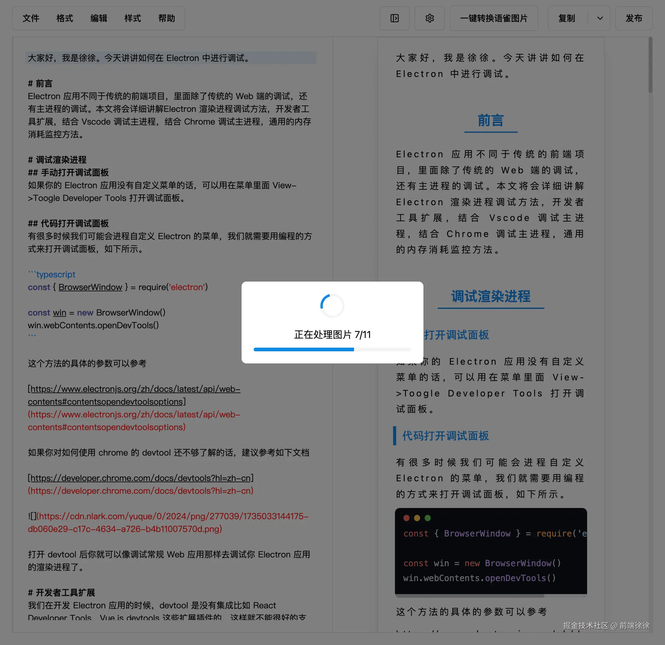 最近一个月我发公众号文章遇到一个问题,那就是从语雀导出的 Markdown 文档在三方网站美化后,然后再拷贝到公众号的时候,图片都上传失败了,无法显示。所以每次我都要把图片全部重新下载下来,然后再一张张插入到拷贝过后的文章当中,图片少的话还好,如果图片非常多就会非常麻烦,耗费时间。